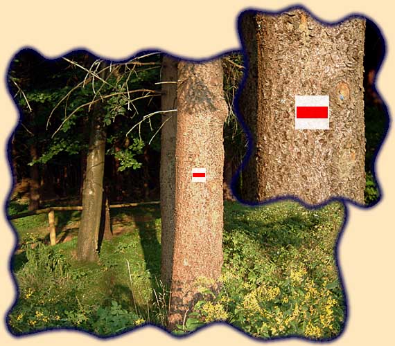 Diese Tour bzw. dieser Tourenabschnitt ist mit der folgenden Farbmarkierung gekennzeichnet. Die Farbmarkierungen befinden sich in der Regel an Bäumen und auf Wegweisern. Auch in einigen Karten sind diese nützlichen Orientierungshelfer eingezeichnet.