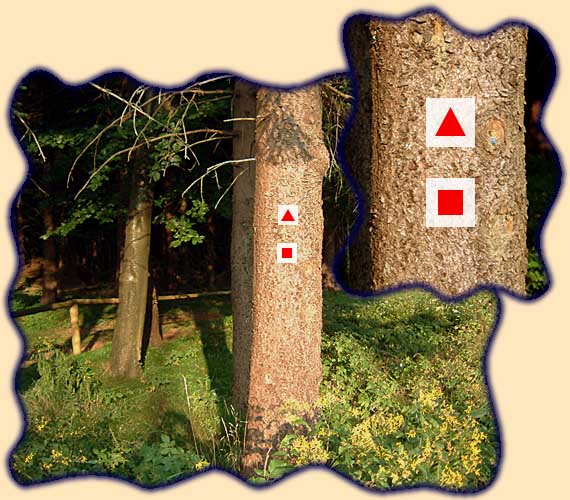 Diese Tour bzw. dieser Tourenabschnitt ist mit den folgenden Farbmarkierungen gekennzeichnet. Die Farbmarkierungen befinden sich in der Regel an Bäumen und auf Wegweisern. Auch in einigen Karten sind diese nützlichen Orientierungshelfer eingezeichnet.