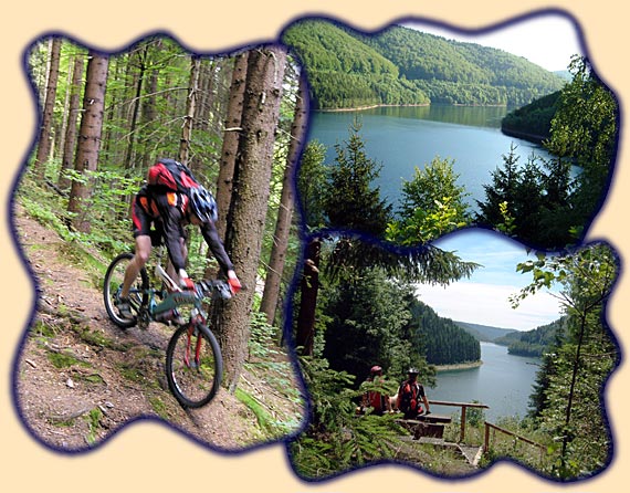 Kaum gestartet, erwartet uns schon das erste fahrtechnische Highlight der Tour. An einem Wegweiser verlassen wir die Promenade nach links und fahren auf einem schmalen Pfad ca. 200 Höhenmeter hinunter an den Vorstau der Talsperre Schönbrunn. Den erst flachen, dann immer steiler werdenden Wurzeltrail kennen einige Biker bereits vom Super 8 Marathon, der jährlich in Frauenwald ausgetragen wird. Am Ende des Singletrails stoßen wir auf einen breiten Schotterweg, den wir bis zum Vorstau der Trinkwassertalsperre Schönbrunn folgen.